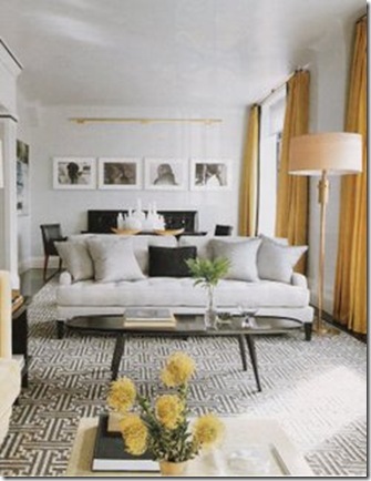 Yellow toss cushions and trim on draperies add a lively spark to these rooms. EKB Interiors